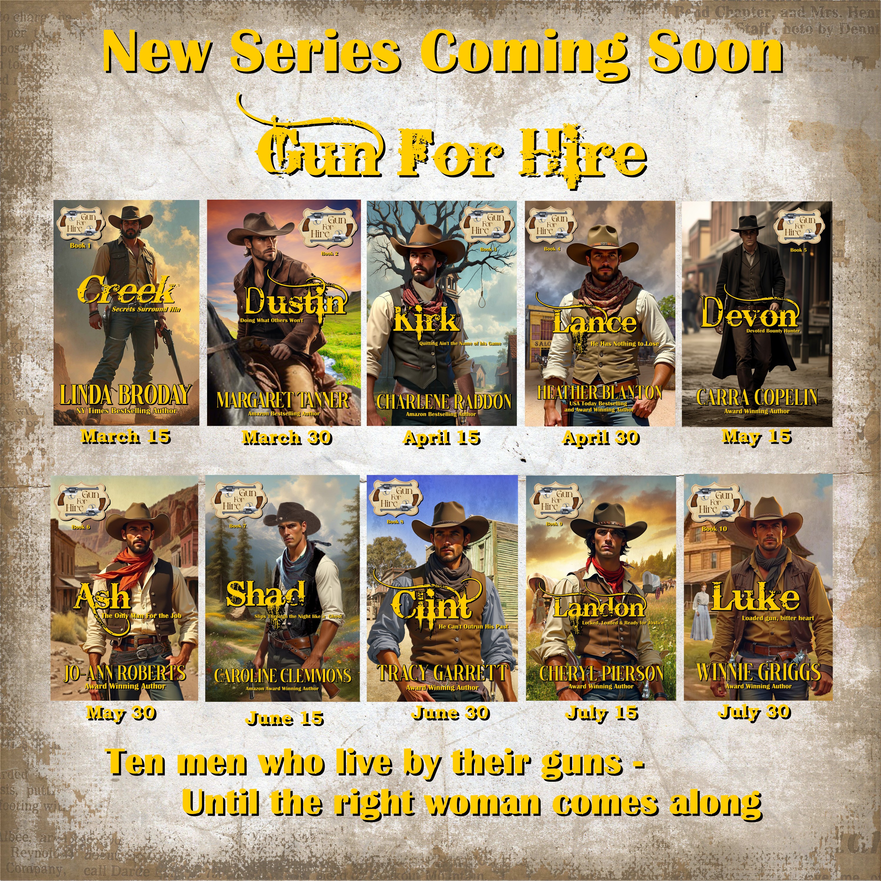 This is book 1 of an exciting multi-author romance western series that features ten Gun For Hire stories following men who live by the gun, surviving one day at a time. Outlaws, bounty hunters, hired guns—each has walked a dangerous path, never expecting a future beyond the next fight. There will be two releases a month until it ends on July 30th.