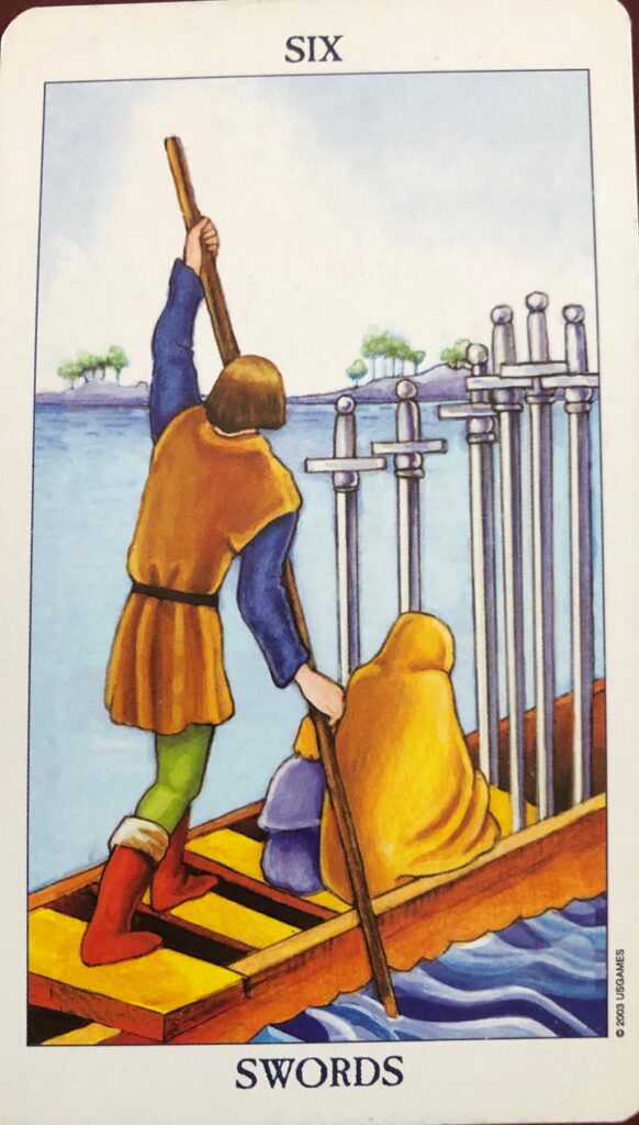 When you look at this card, notice the turbulent water on one side of the boat and calm waters with a serene island ahead on the other side. That is indicative of moving through a troubling time toward something better. But the most significant aspect of this card is the man who is rowing the boat. It is telling us we are never alone and we have help to navigate through it. The swords in front of the woman and child indicate the intellect and shows how we can trap ourselves with thoughts. Shift your thoughts and you shift your perspective. Trust the healing journey.